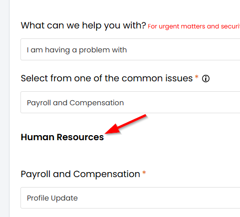 Whether you’re submitting a ticket through "I have a question for a specific department" or some of the other categories, you’ll now notice HR-related options embedded throughout the selections.